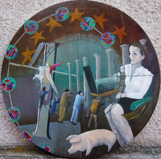 Bär: „Jojo, eijentlich sollte da Europa op däm Stier reitend zu sehen sein. Ävver dann han ich mir jedaach, leever die Bürokratie in Europa darzustellen un han en Sekretärin jemalt, die unsinnige EU-Verordnungen en dä Laptopp tippt.“