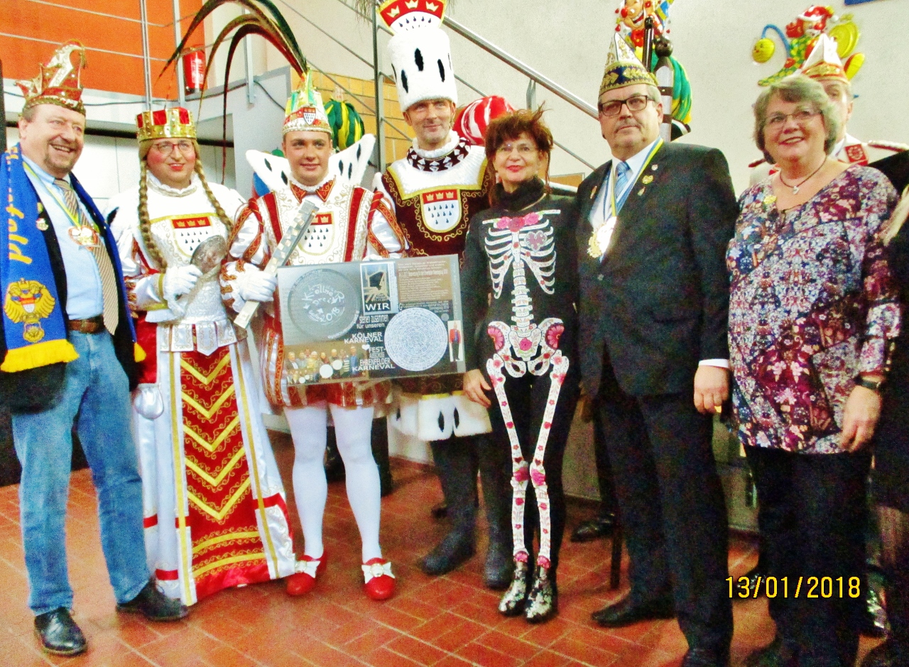 Karnevalistischer Empfang der Bezirksvertretung Köln-Ehrenfeld („Sitzung en d’r Prummebud“) – Siglinde Kallnbach überreicht Bezirksbürgermeister Josef Wirges (links) und dem Kölner Dreigestirn ihre Unterschriftensammlung „a performancelife“ („Wir stehen zusammen für unseren Kölner Karneval“). Foto: Raap/Bär