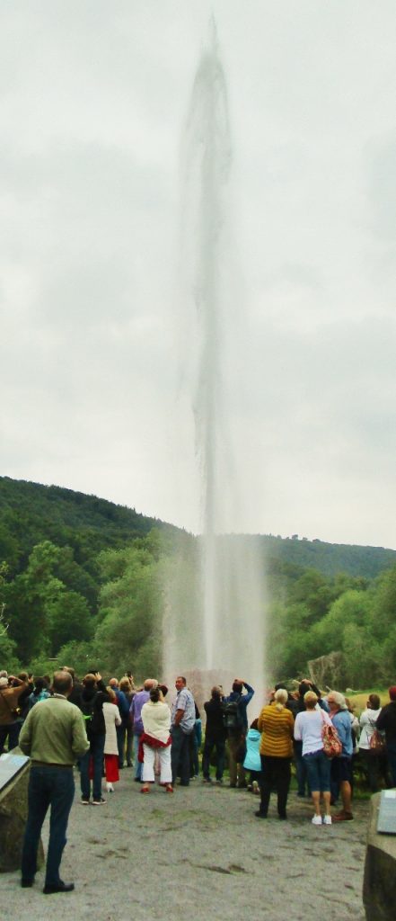Bär polyglott- unterwegs mit Herrn Bär Wer nicht so weit zu den Kaltwasser-Geysiren von Soda Springs in Idaho (USA) oder dem Mokena Geyser von Te Aroha (Neuseeland) reisen will, zumal es neuerdings gilt, unterwegs keine „ökologischen Fußabdrücke“ zu hinterlassen, der kann auch auf einer Fahrt mit der Deutschen Bahn von Köln ins beschauliche Andernach am Rhein jede Menge Abenteuer erleben. Diesmal war nämlich das Stellwerk von Sechtem kaputt, doch der Zugführer war immerhin um Service-Freundlichkeit bemüht, als er per Lautsprecher den Text durchgab: „Verehrte Fahrgäste, wir halten jetzt bis auf unbestimmte Zeit in Brühl. Sie können ruhig draußen auf dem Bahnsteig eine Zigarette rauchen; ich sage Ihnen rechtzeitig Bescheid, ob und wann es weiter geht“. Das Fährschiff in Andernach zu der Halbinsel mit dem Geysir legt allerdings immer absolut pünktlich ab; und der Geysir dort lässt eigenartigerweise ebenso pünktlich exakt alle 100 Minuten seine Fontäne acht Minuten lang hochspritzen, und dies aus dem Gestein in 350 Metern Tiefe. Jedenfalls ist der Geysir von Andernach zuverlässiger als das Stellwerk von Sechtem, und an der Pünktlichkeit der Natur sollte sich die Deutsche Bahn mal ein Beispiel nehmen. Und wer eine vorzüglich-zarte hausgemachte Rinderroulade und dazu einen Leutesdorfer Riesling mit mineralisch-dezenter Säure zu schätzen weiß, der kehre anschließend in Andernach im Hotel-Restaurant „Rheinkrone“ ein.